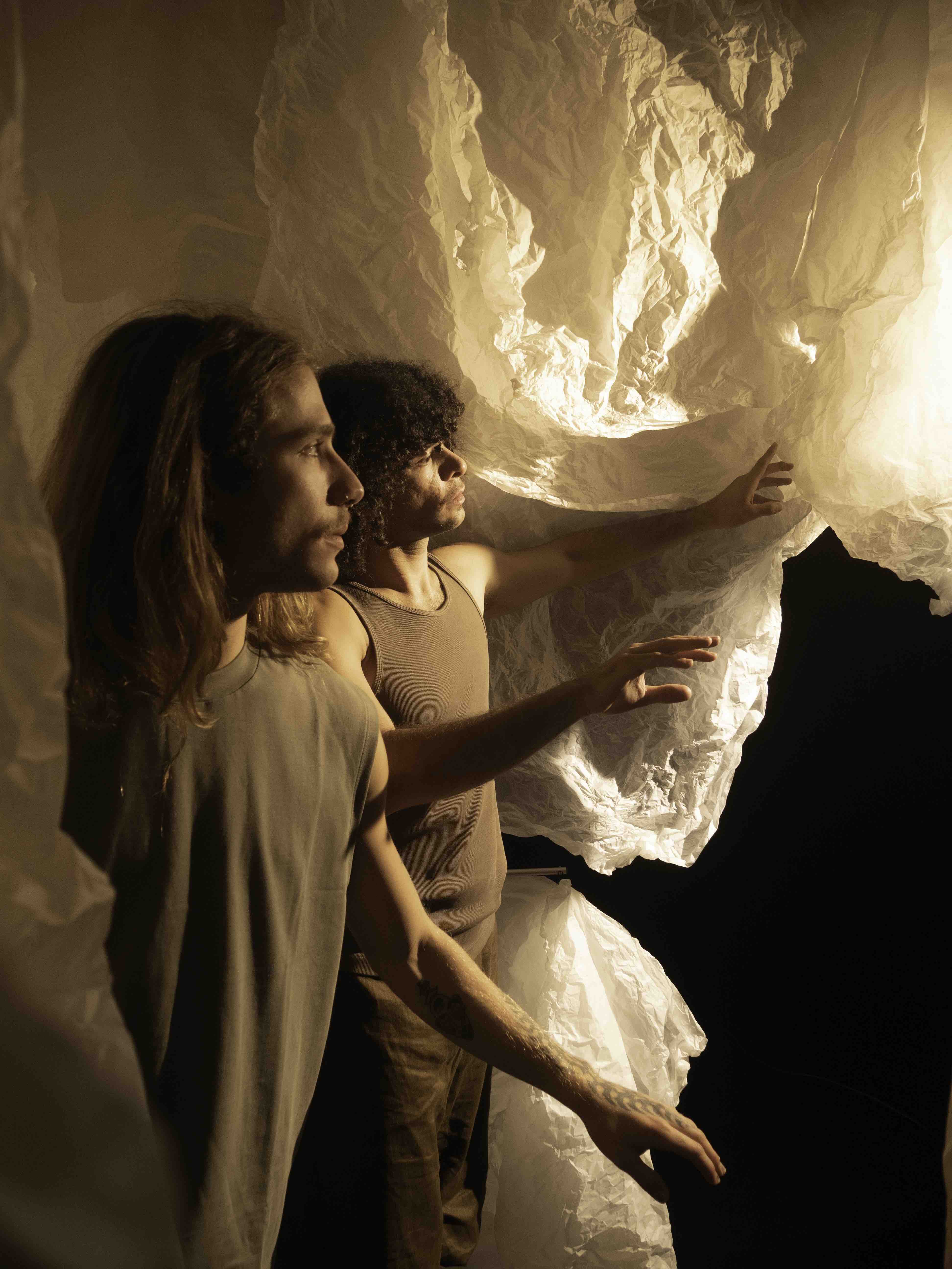 Ehab ist Palästinenser, Ben ist Israeli. Gemeinsam mit Fabian Cohn entwickelten sie ein Tanzstück – gerade jetzt, trotz allem. Im Bühnenraum hängt ein raumgreifendes Wolkengebilde: eine Projektionsfläche für Erwartungen, Zuschreibungen und das Gewicht eines allgegenwärtigen Konflikts. Zwei Menschen bewegen sich in und mit dieser Wolke. Zwei, die ständig mit Fragen nach Identität und Zugehörigkeit konfrontiert werden. Menschen mit Geschichten, die einander zuhören. Menschen, denen wir zuhören können. Das