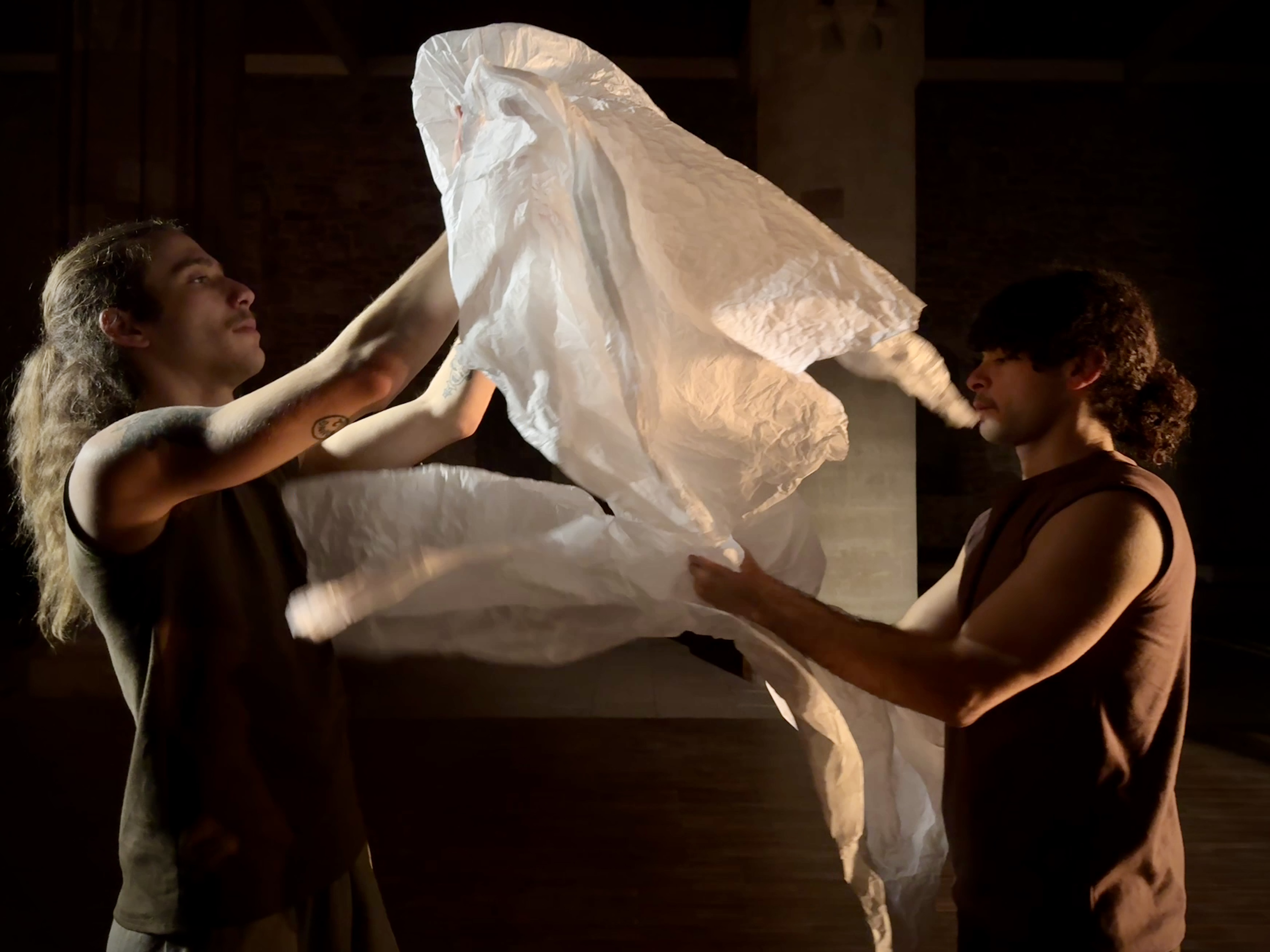 In the stage space hangs an expansive cloud-like structure: a projection surface for expectations, attributions, and the weight of an ever-present conflict. Two people move in and with this cloud — sometimes side by side, sometimes opposite one another, sometimes together. Two who are constantly confronted with questions of identity and belonging. People with stories who listen to one another. People we can listen to.