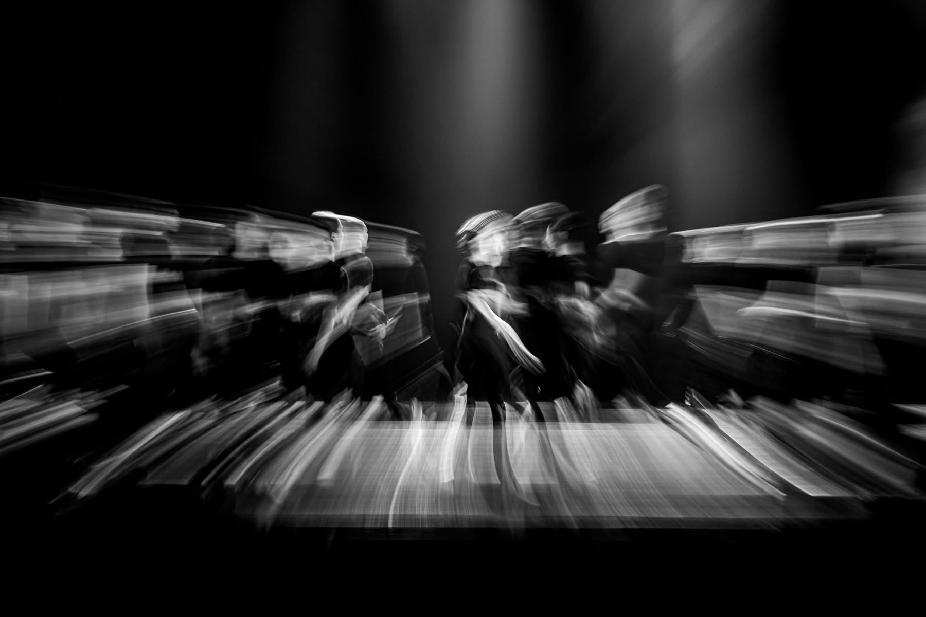 In the contemporary dance piece 'ORBITING,' the dancers explore constantly changing circular constellations, creating a mesmerizing visual poetry. Like planets or electrons, the performers orbit one another in precise walking patterns, weaving mandala-like formations that continuously evolve and dissolve. This perpetual motion serves as a powerful metaphor for navigating life's constant changes while seeking harmony and meaningful connection.